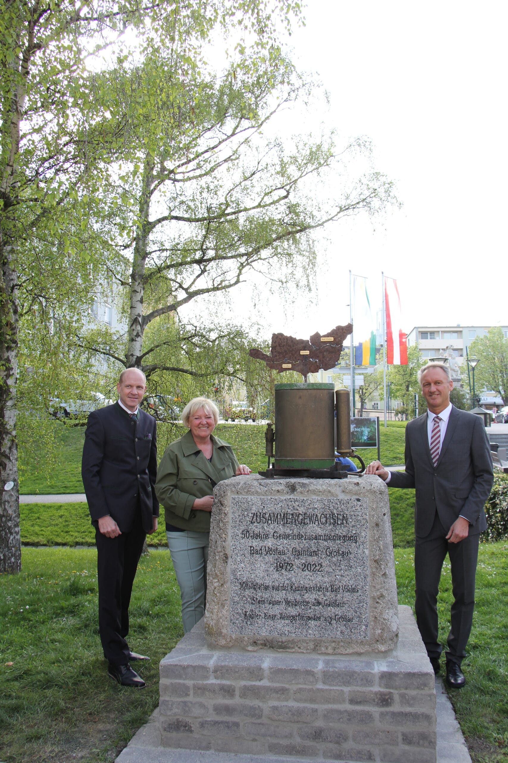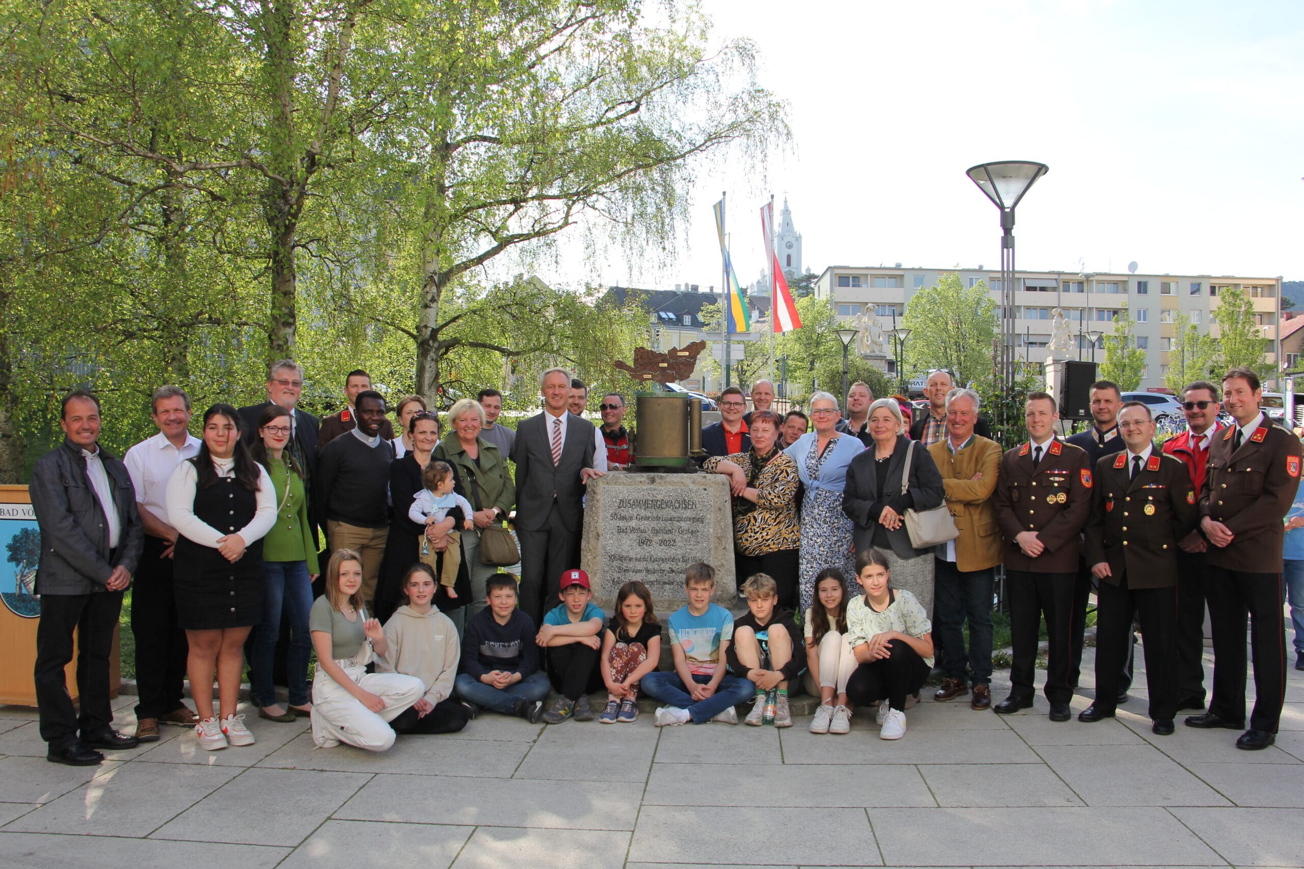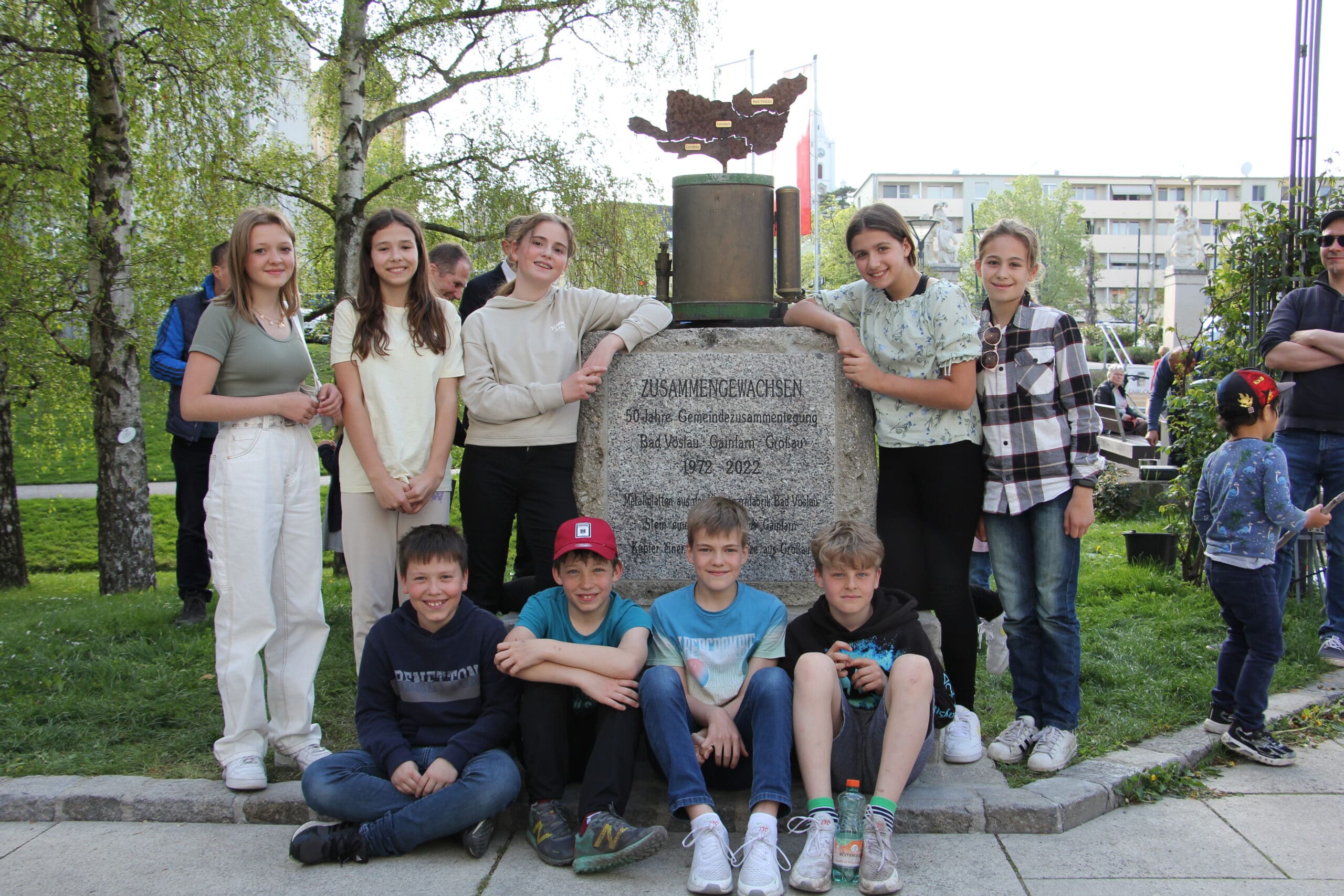 Das Projekt mit der Stadtgemeinde Bad Vöslau, das unlängst auf der Homepage angekündigt worden war, wurde heute abgeschlossen. Bei einem Festakt wurden die Briefe der Schülerinnen und Schüler in einer Zeitkapsel in ein Denkmal eingegraben, das zum 50. Jahrestag der Zusammenlegung der drei Ortsteile von Bad Vöslau errichtet worden ist. Nach einer Rede des Herrn Bürgermeisters und einer gemeinsamen Gesangsdarbietung der Chöre der drei Ortsteile wurde das Denkmal enthüllt, die Briefe wurden in die Zeitkapsel gesteckt und diese wurde anschließend vergraben.