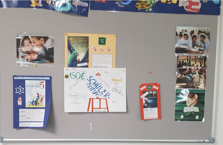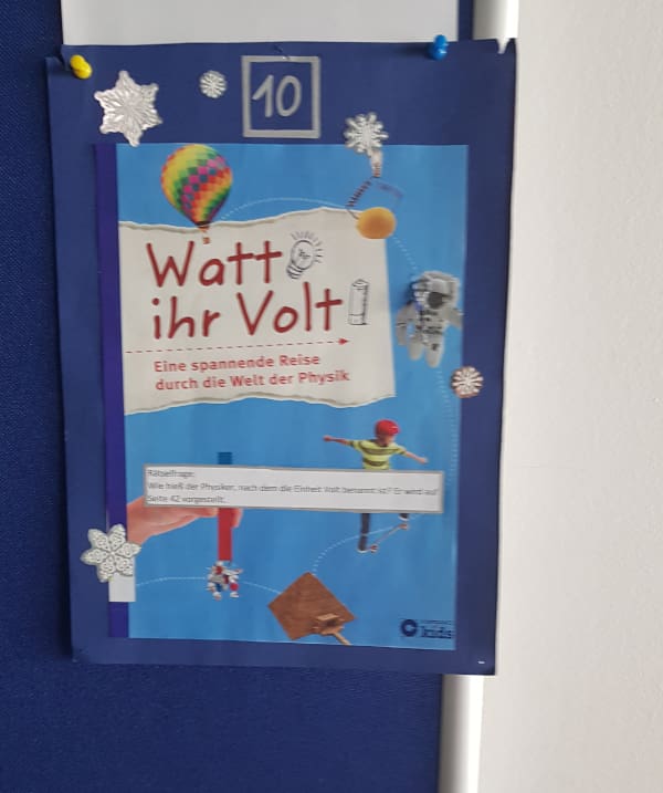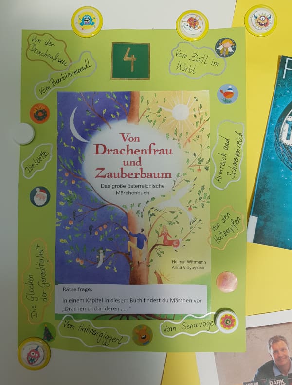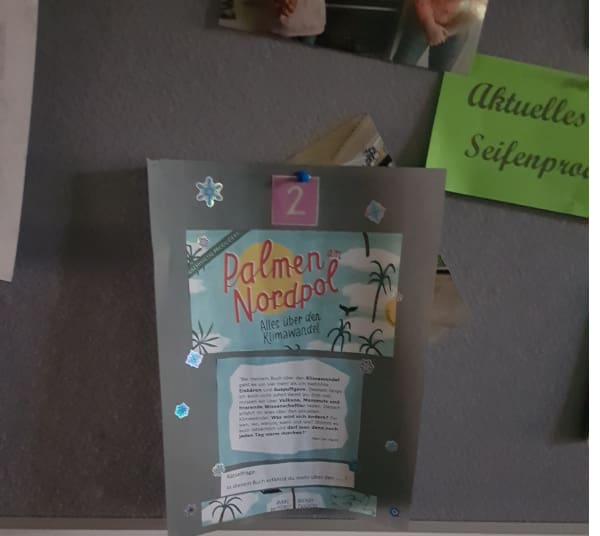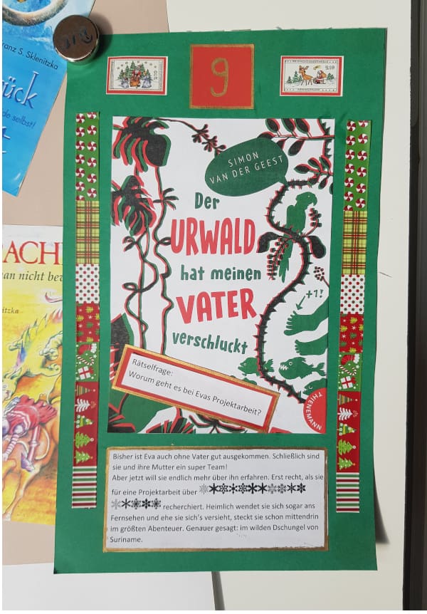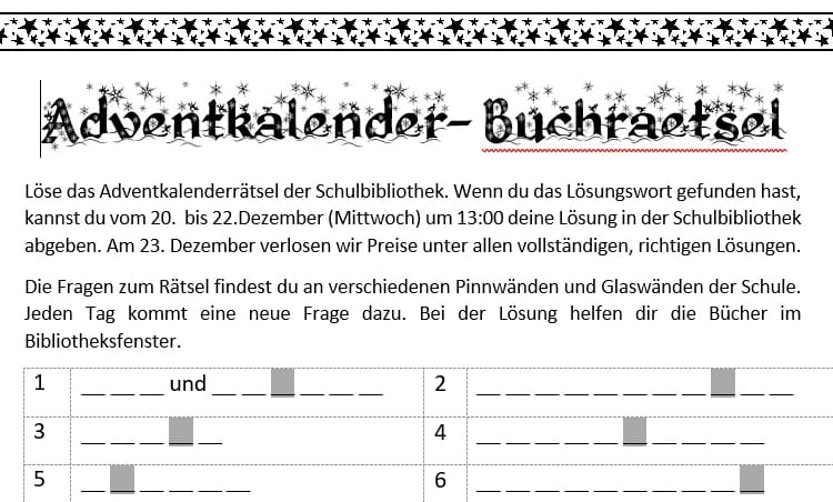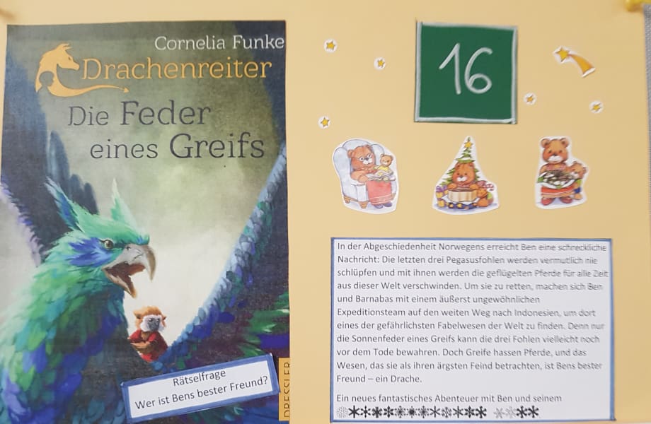 Im Advent gab es dieses Jahr einen besonderen Buch-Adventkalender. Jeden Tag konnten die Schüler im Schulgebäude ein neues Plakat entdecken, auf dem ein Buch der Schulbibliothek vorgestellt wurde und eine Rätselfrage zum Buch zu lesen war. Im Schaufenster der Bibliothek konnte die Frage mit Hilfe des Buches gelöst werden.