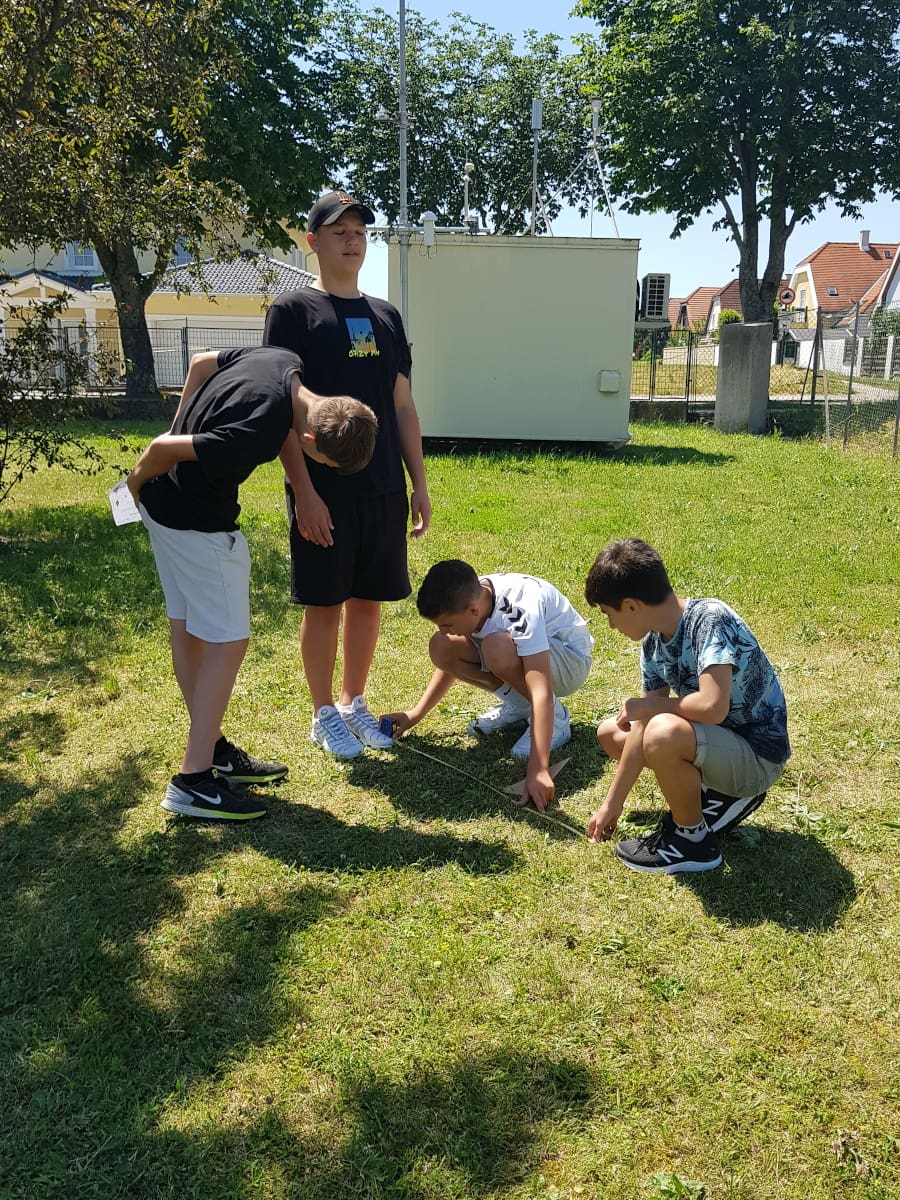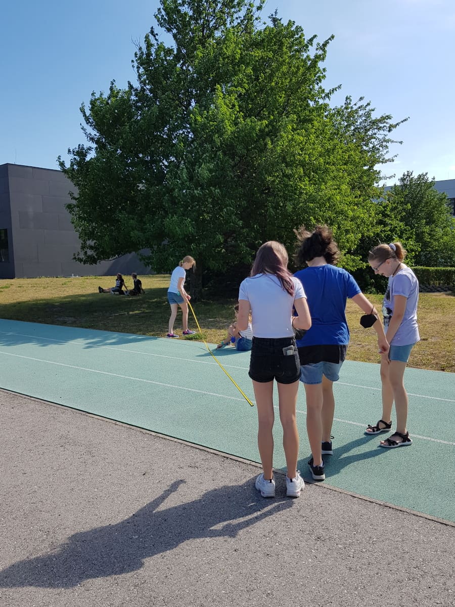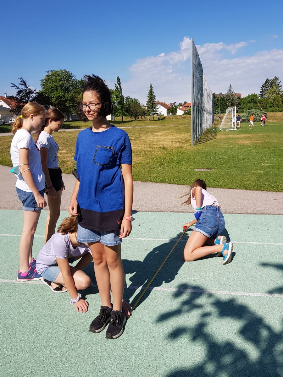 Die Klassen 3ARS und 3EW versuchten im Mathematikunterricht, die Höhe von Bäumen im Schulgarten mit Hilfe des Strahlensatzes zu bestimmen: